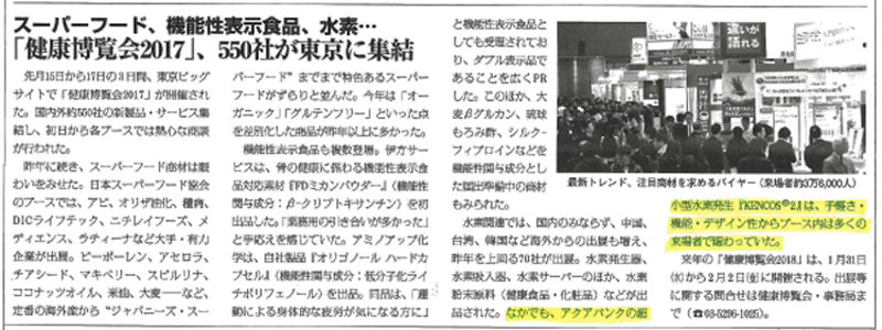 弊社ブースの様子は、テレビ朝日の朝の情報番組『グッドモーニング』(2017年2月16日放送)をはじめ、『健康産業新聞』(2017年3月1日発行)、雑誌等、たくさんのメディアの方々にとりあげていただきました。